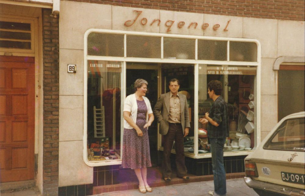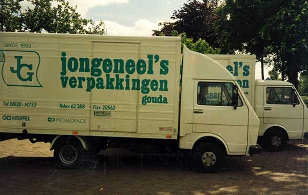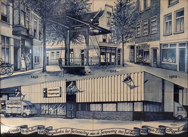 De handgeschilderde tegels in onze hal op de eerste verdieping geven een heel aardig overzicht van de ontwikkeling van ons bedrijf. Bescheiden, maar vol enthousiasme in 1893 begon Albertus Jongeneel op de Oosthaven met een drukkerijtje en de verkoop van rookwaren en kantoorbenodigdheden. De volgende verhuizing was in 1906 naar de hoek Nonnenwater / Hoge Gouwe. En vrij snel daarna (1923) kwamen we terecht op de Lange Groenendaal, waar we het heel lang hebben uitgehouden door her en der in de buurt opslagruimte te huren. In deze periode werd ook duidelijk dat we ons meer gingen specialiseren in verpakkingen. De ansichtkaarten en Goudse pijpen verdwenen van het toneel en het werden meer tassen, zakken en dozen. Van particuliere verkoop werd langzaam overgeschakeld naar het groothandelen. In 1989 vertrokken we met pijn in ons hart uit de binnenstad van Gouda, maar het ging echt niet meer in de Lange Groenendaal. We betrokken een prachtig pand aan de Nieuwe Gouwe Oostzijde. Daar konden we het tot ver in de 21e eeuw vast wel uitzingen. Riante kantoren, ruime showroom en een magazijn zo groot… Jammer dan, want ook hier groeiden we snel uit onze jas. Weer hetzelfde verhaal met her en der opslagruimte huren tot het niet meer ging en we verhuisden in oktober 2000 naar onze huidige locatie.